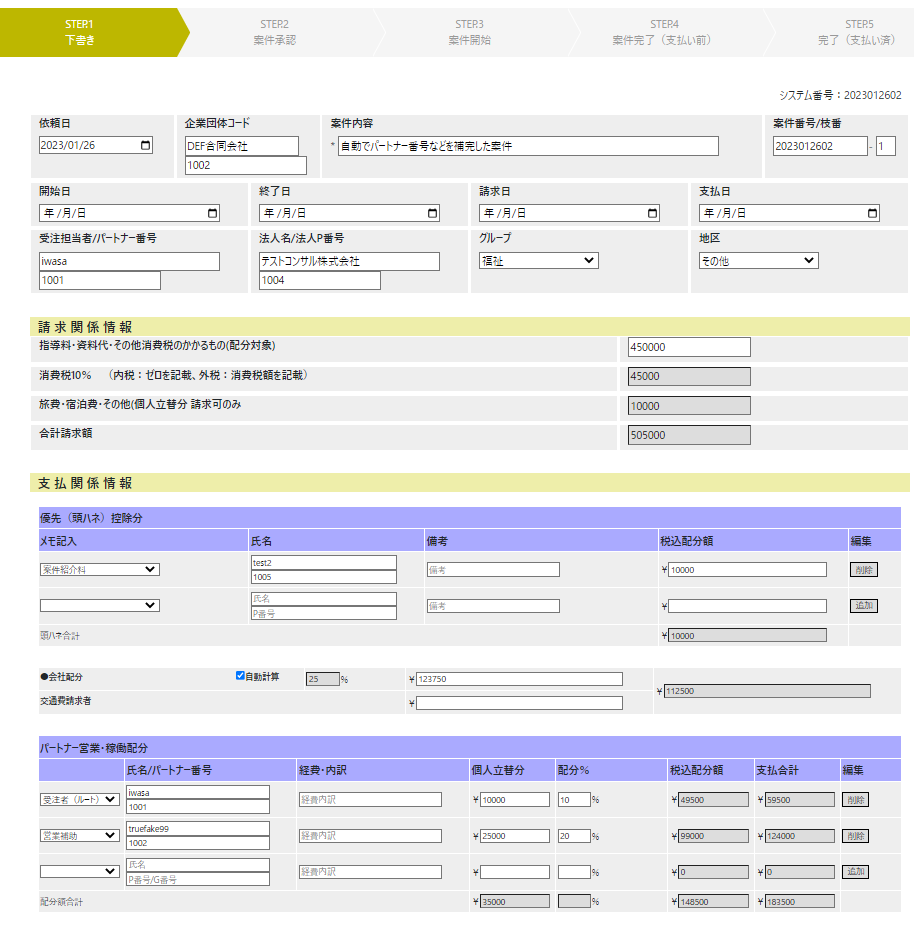 一つの案件に複数の担当者や複数の費用が割り振られます。指定の値が入力された場合、別の項目を表示・非表示、もしくは数式で計算するといった個別の機能はヒアリングの後、個別にプログラミングします(半オーダーメイド)